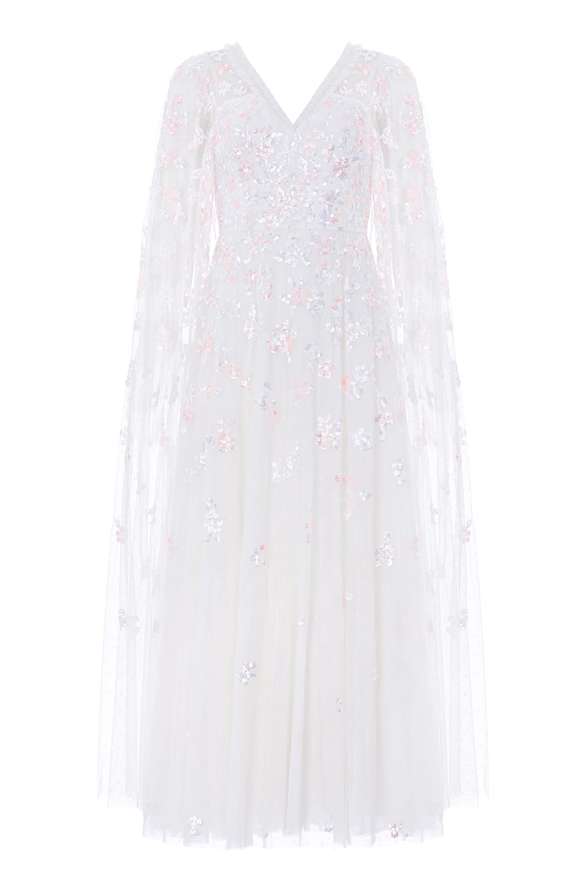 NEW SEASON. The Freesia Shimmer Cape Sleeve Ankle Gown in Swan White/Pink. This ethereal gown features subtle shimmering detailing across a softly sculpted silhouette. Designed with flowing cape sleeves and an ankle-length skirt, it moves effortlessly with every step. Ideal for elevated evening events and special celebrations.