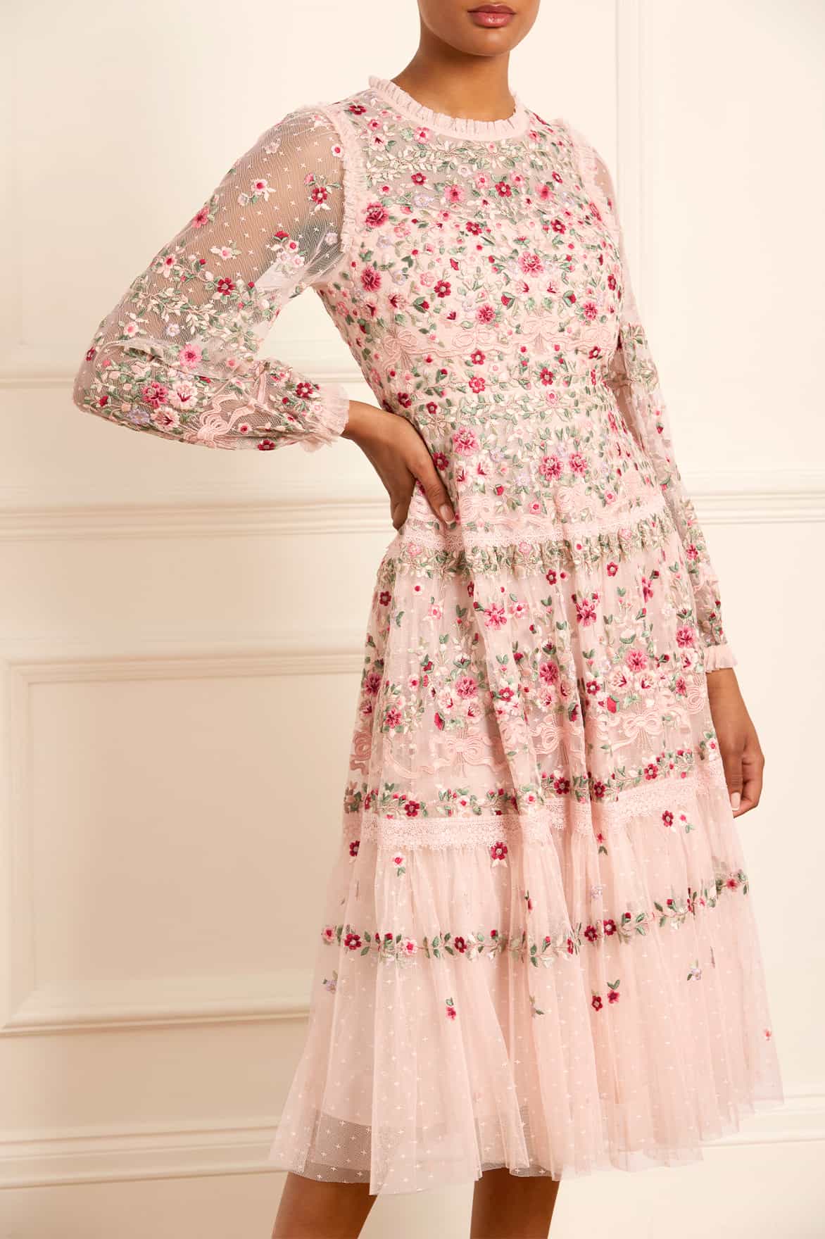 NEEDLE & THREAD EXCLUSIVE. The Ribbon Bouquet Midaxi Dress in Petal Pink. This midaxi dress is intricately designed with embroidered bouquets of flowers in rich tones, inspired by a 1930s vintage print. Beautifully adorned with delicate lace trims for signature Needle & Thread detailing. The skirt is developed with layers of tulle to create a romantic silhouette. The perfect dress for an upcoming occasion.