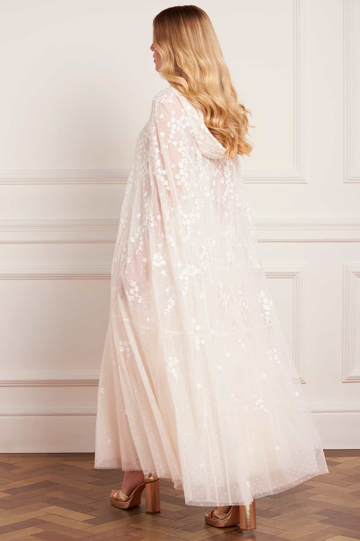 NEW SEASON | NEEDLE & THREAD EXCLUSIVE. The Scatter Blossom Hooded Long Cape in Cream. An enchanting piece adorned with delicate ditsy embroidery. Designed with a softly draped hood and floor-length silhouette, this exclusive cape adds ethereal charm to any occasion look.