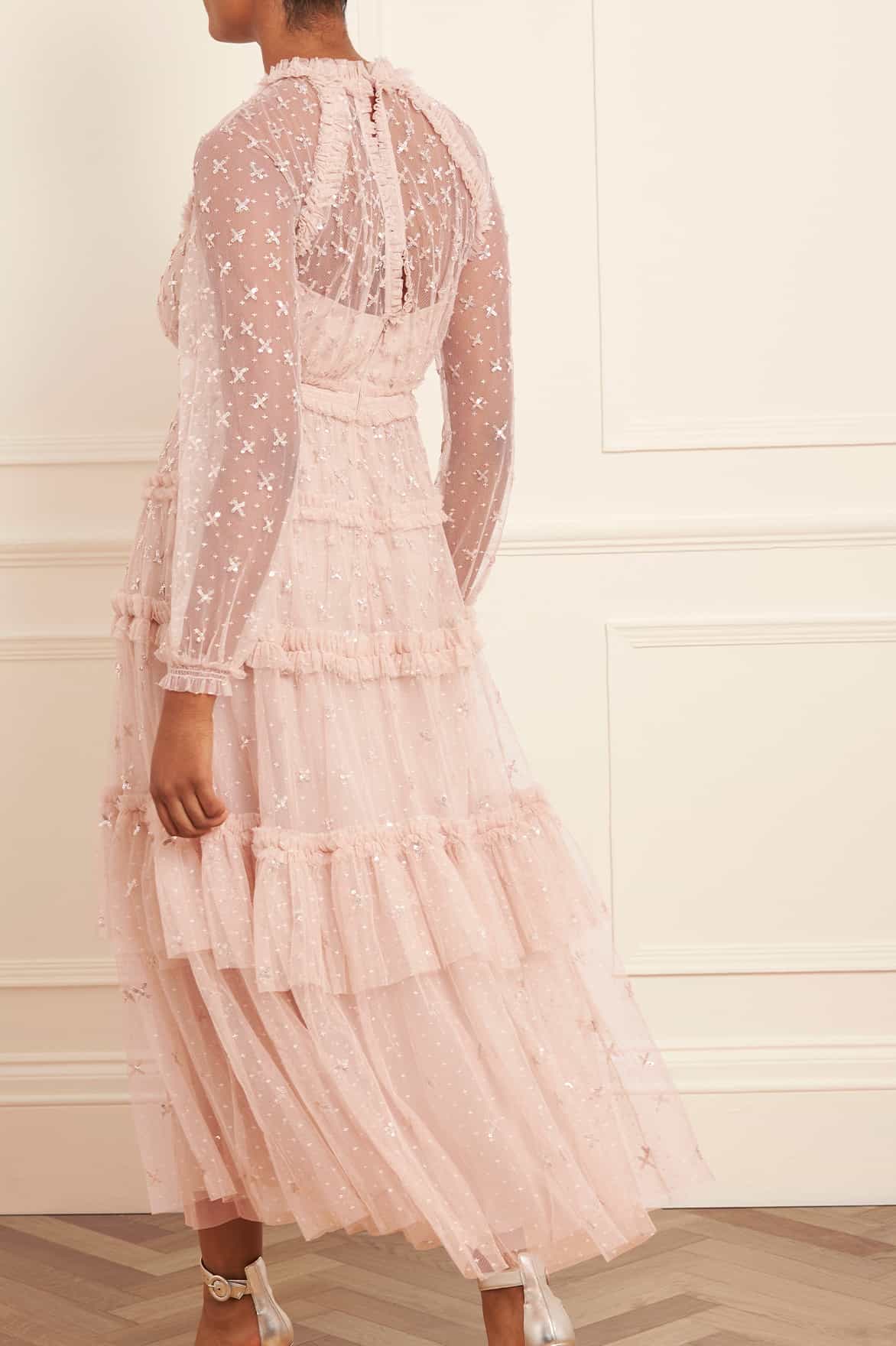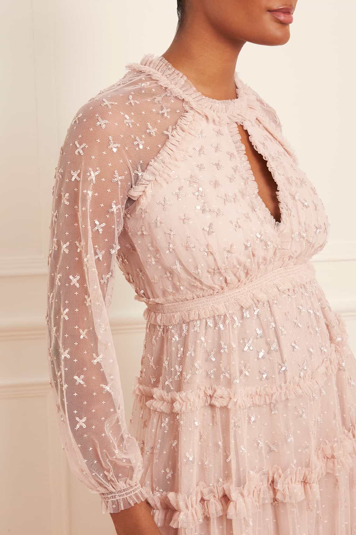 The Sequin Kisses Ankle Gown in Pebble. Beautifully adorned with intricate star motifs scattered throughout, creating an enchanting, shimmering effect. This flattering gown is developed with a smocked waist, long sleeves and tulle frill detailing. Designed with elasticated cuffs and a keyhole neckline for an effortless look. The perfect gown for an upcoming special occasion.