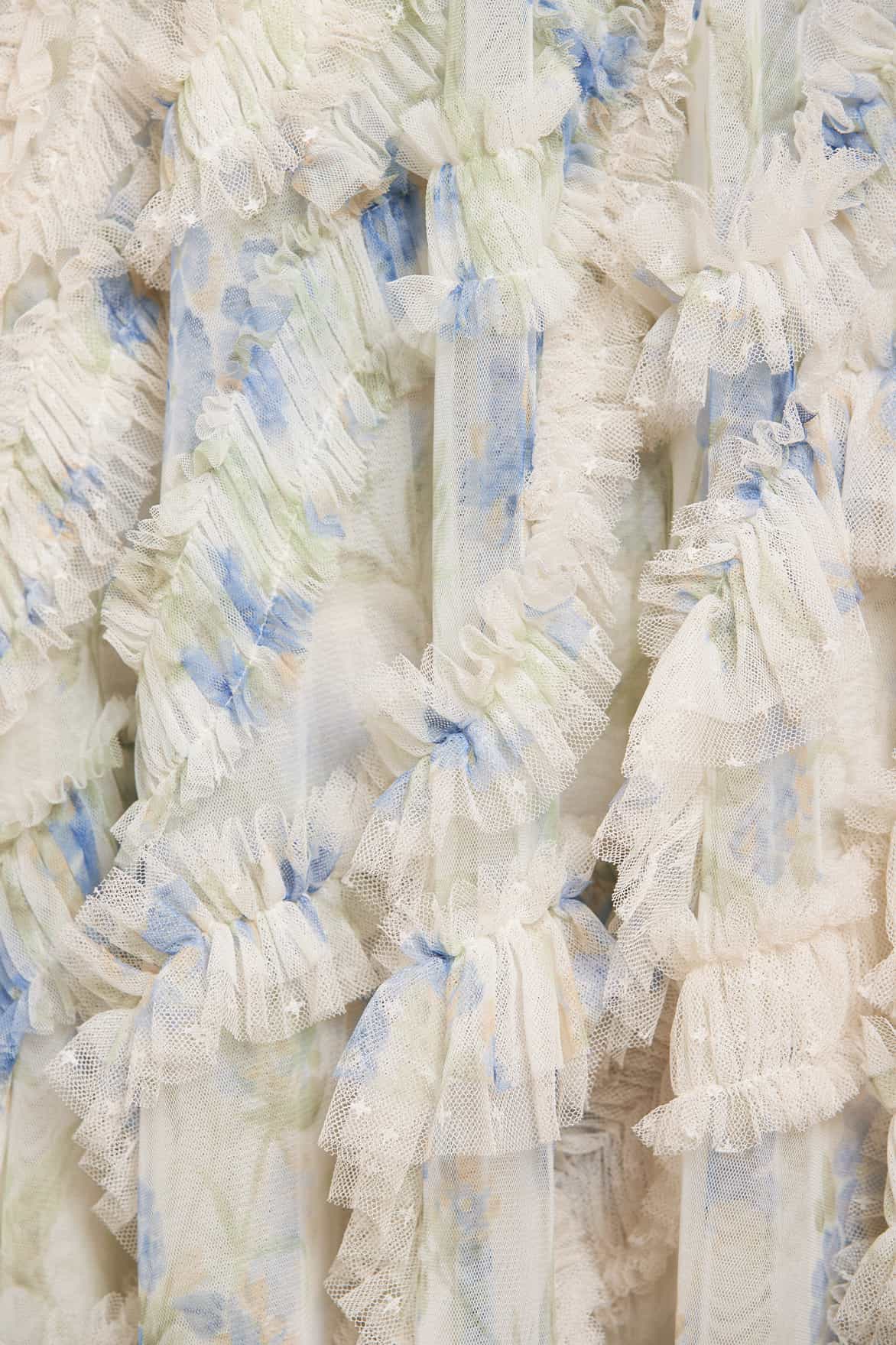 - Floral printed tulle decorated with tulle ruffles
