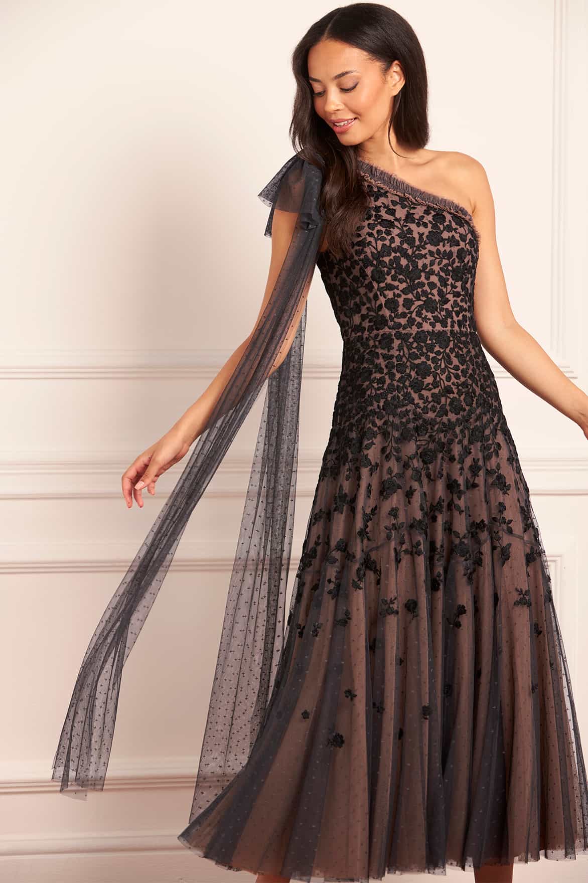 NEW SEASON. The Sylvia Rose One-Shoulder Bow Ankle Gown in Graphite/Warm Taupe. A dramatic reinterpretation of heritage florals. Featuring embroidered roses across tulle layers, the gown is framed by an asymmetrical neckline and a statement bow on one shoulder. The graphite and taupe tones merge drama with softness, making it a striking evening gown.