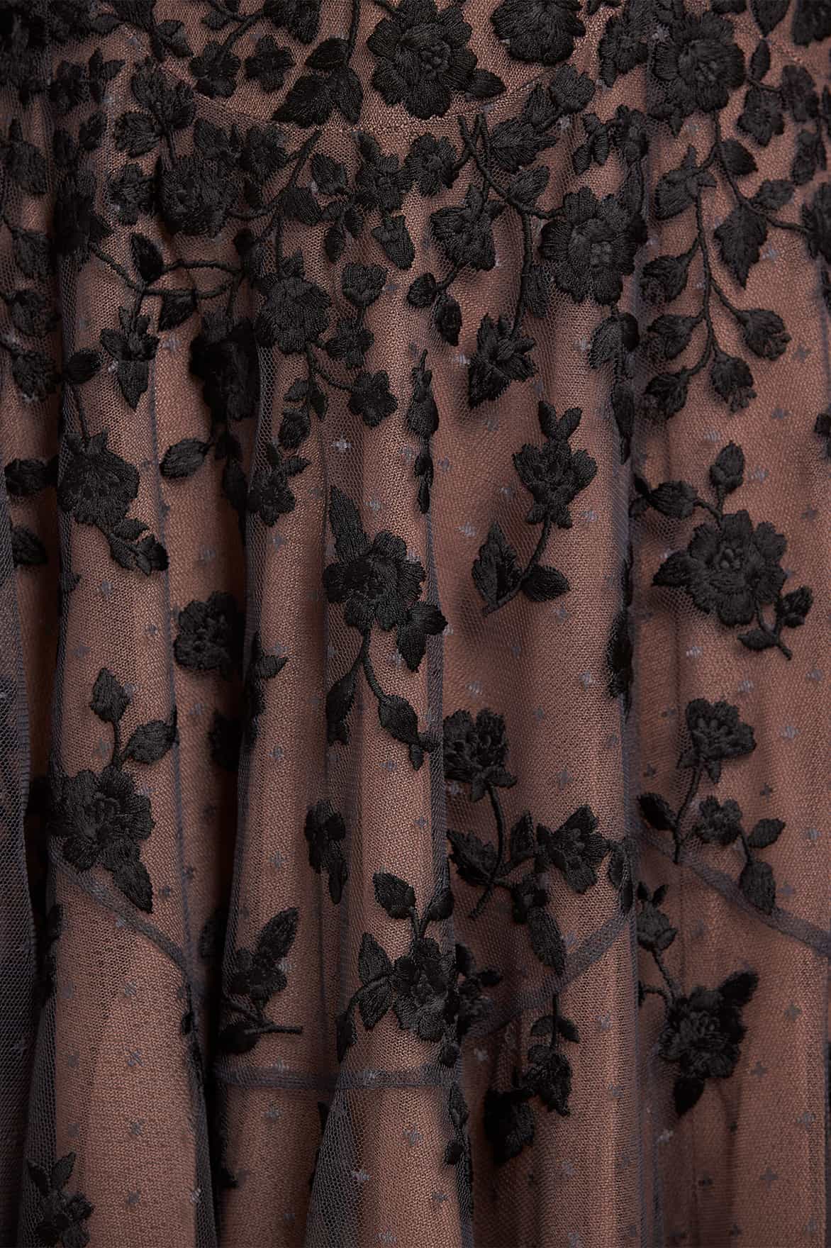 - Kisses tulle decorated with floral embroidery.