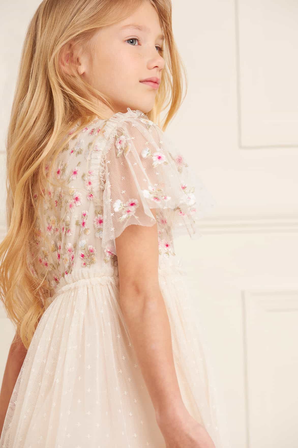 NEW SEASON. The Wildflower Ditsy Bodice KIDS Dress In Cream/Azalea Pink. The bodice of the dress is embroidered with floral motifs in soft, pastel shades inspired by floral garden paintings. Developed with a soft tulle skirt creating playful movement as she walks. Let your little one twirl around in the Wildflower at her next event.
