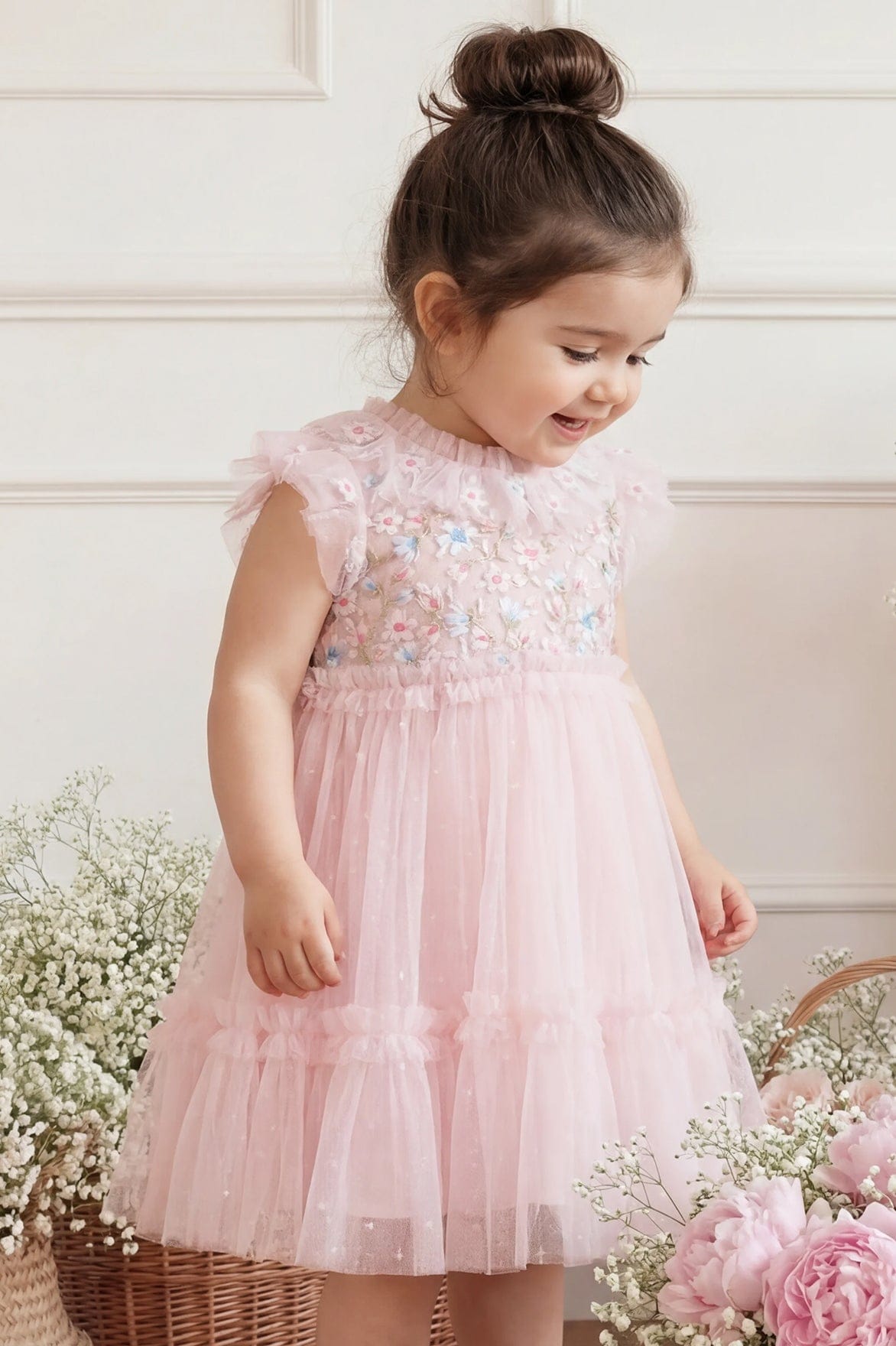 The Antoinettes Floral Bodice Baby Dress in Peony Pink. A dreamy piece inspired by the romance of Versailles. Crafted with delicate multicoloured floral embroidery scattered across a cloud of tulle, signature frills at the neckline and waist add a touch of enchantment. Designed with layered tulle sleeves and a gently ruffled skirt, it creates a floaty, ethereal silhouette. Finished with a breathable cotton voile lining and frilled bloomers for comfort. This dress is perfect for every magical moment.