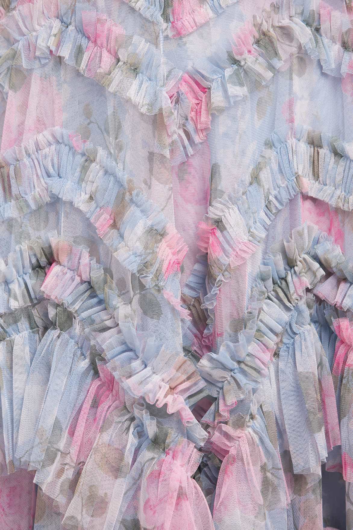 NEW SEASON. The Camille’s Garden Elia Halter-Neck Gown in Skylight. Features a soft, painterly floral print inspired by vintage artwork. Designed with a halter neck and frothy signature Needle & Thread tulle ruffles, this timeless gown moves beautifully for a refined, romantic finish.