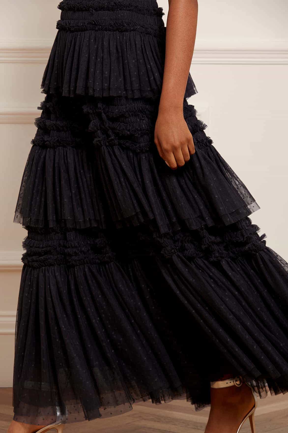 The Candice Gown in Graphite. This stunning gown features whimsical ruffles and layered frills to create a flattering, statement look. Designed with soft, layered tulle for a romantic silhouette as you walk. Make the ultimate statement in this show-stopping gown.