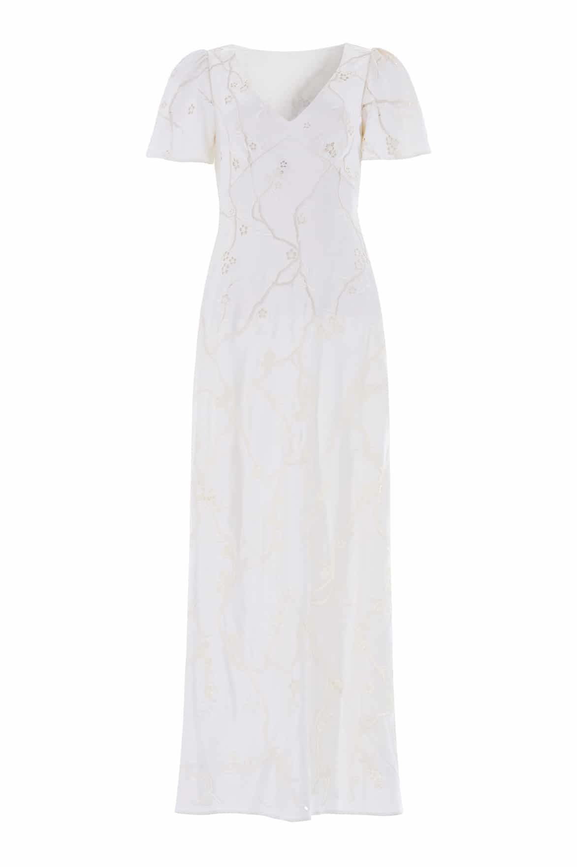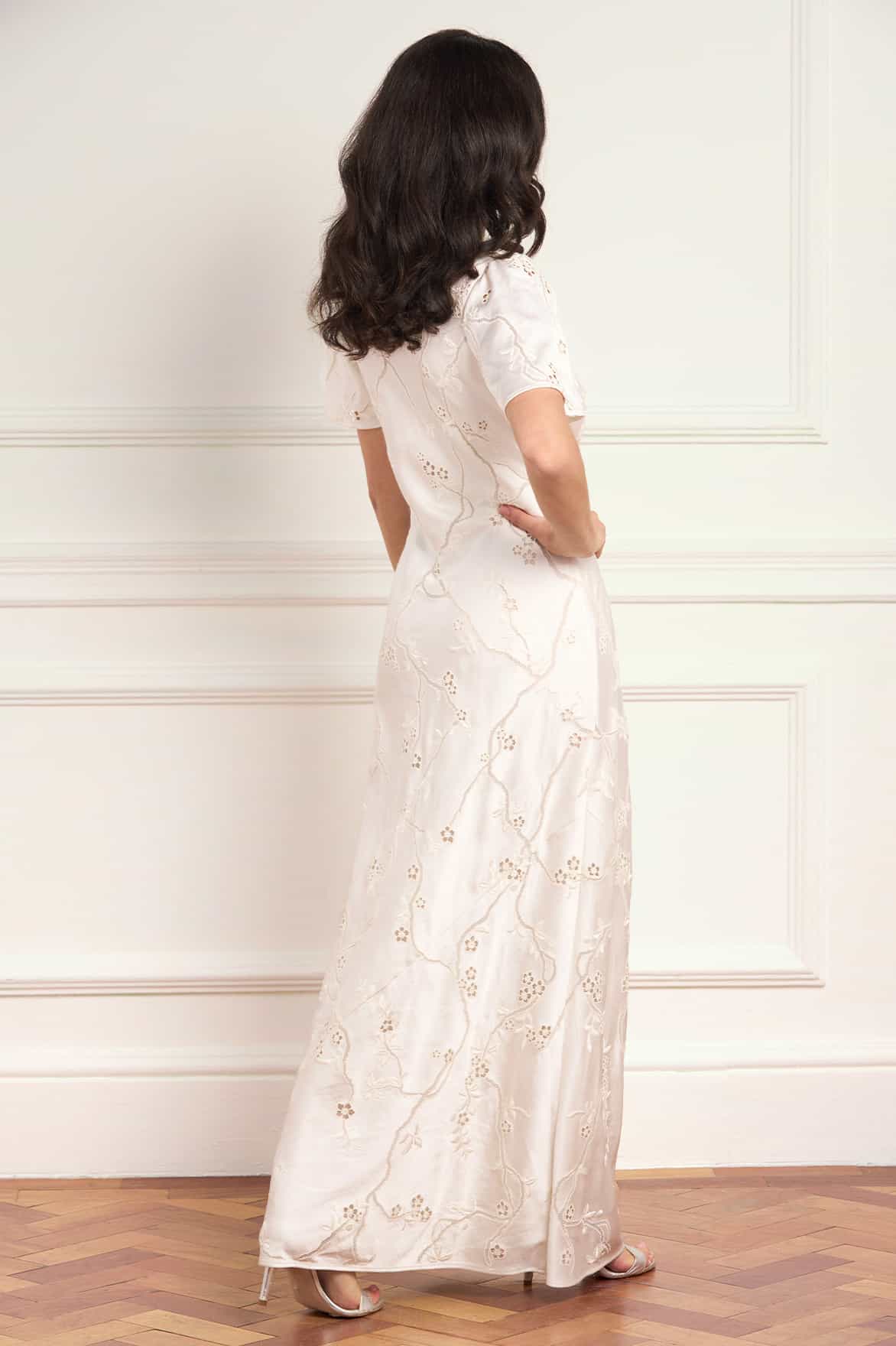 NEW SEASON. The Cherry Blossom Satin Short Sleeve Gown in Cream. An exquisite satin gown embroidered with a trailing cherry blossom motif inspired by romantic archive florals. Designed with softly fluted short sleeves and cut on the bias for a smooth, flattering fit. Ideal for summer occasions and elegant evening events.