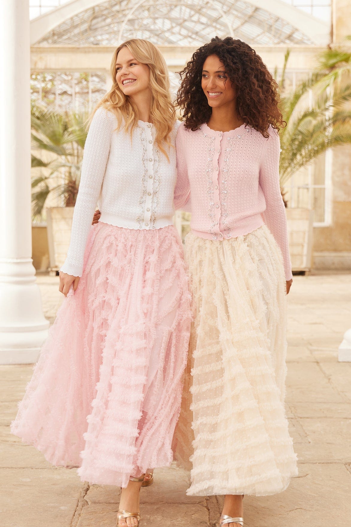 The Crystal Border Short Cardigan in Cream. This soft wool cardigan is decorated with delicate crystal embellishment, faux pearls, and diamante floral motifs creating feminine detail. Crafted with signature Needle & Thread scallop details, twisted cable stitch, and a ribbed neckline. Developed with slim fit sleeves, short in body length and a fitted silhouette. Make this cardigan your new wardrobe staple.
