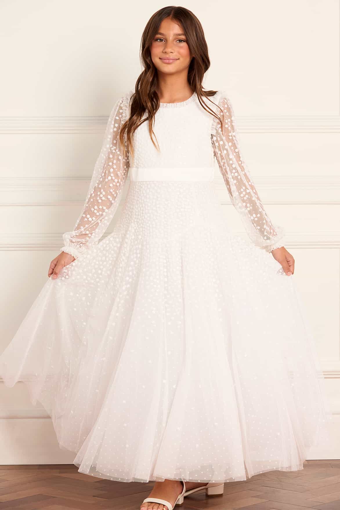 NEW SEASON. The Dappled Sequin Long Sleeve Kids Gown in Swan White. Glimmers with scattered sequins across layers of tulle. Designed with long sleeves and a soft, flowing skirt, this gown adds gentle sparkle to special occasions.