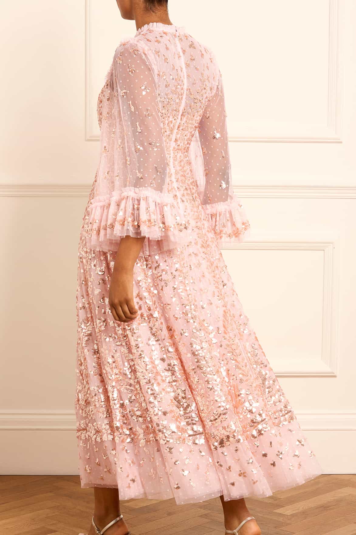 The Fern Ankle Gown in Dusk Pink/Caramel. Inspired by a historical archive artwork, this gown features a shimmering statement sequin border on the skirt hem with a trailing glittering motif design that disperses towards the dress. Crafted in soft tulle with signature Needle & Thread frills, this luxurious style boasts voluminous sleeves with embellished motifs and romantic frills at the cuffs, adorned with glistening sequins. The sequins have a special high-shine gloss finish created by extra foil coating. The skirt is generously made up of layers of soft, delicate tulle and net. A classic and contemporary style.