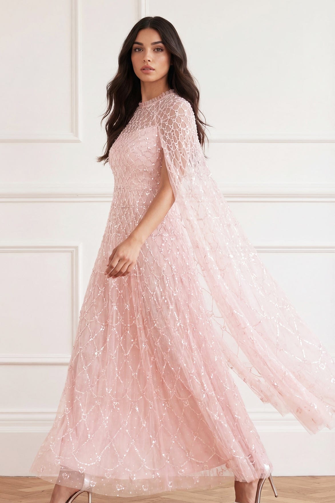 NEEDLE & THREAD EXCLUSIVE. The Heart Lattice Ankle Gown in Dusk Pink. This gown is decorated with intricate embellishment made using the smallest sequins for exquisite detailing. Beautifully designed with heart-shaped motifs in a lattice layout. This gown features our new floor-length cape for romantic detailing and a statement look. Make an entrance at your next event.