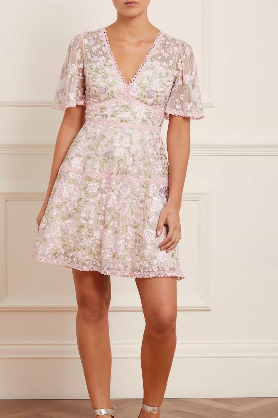 The Lavender Rose Micro Mini Dress in Champagne. This dress is beautifully crafted with romantic rose petal embroidered artwork, inspired by traditional English roses. Featuring floral motifs in soft pastel tones, a classic Needle & Thread silhouette and intricate lace trims for a premium finish. The perfect dress for any occasion.