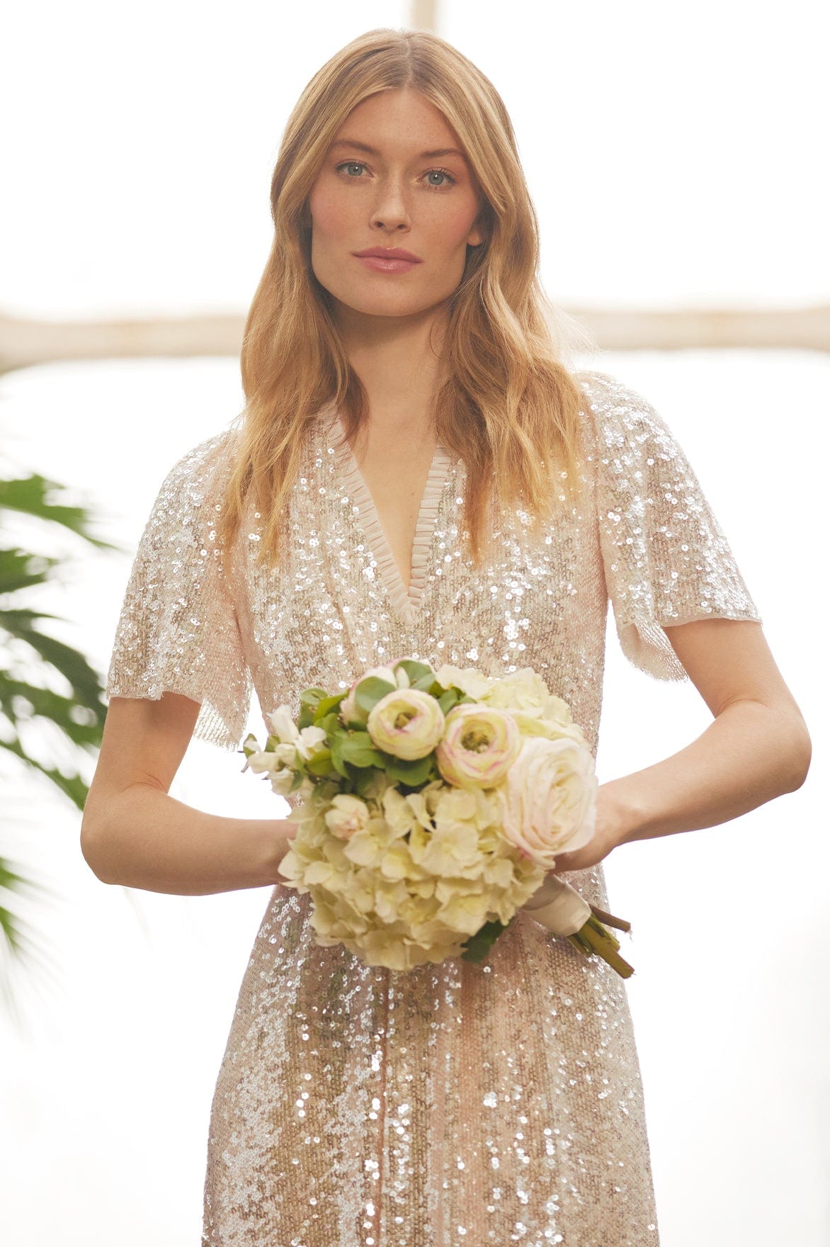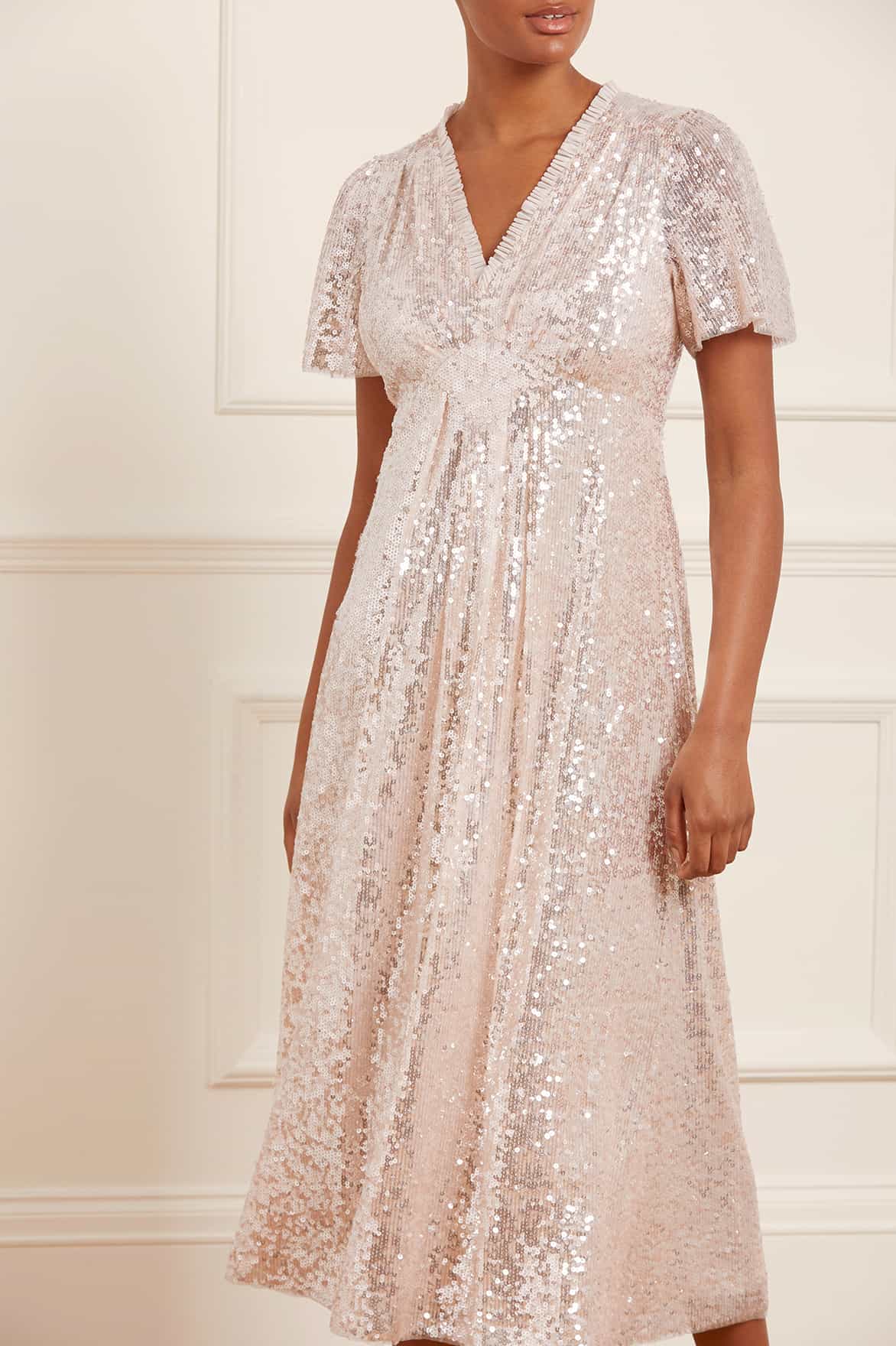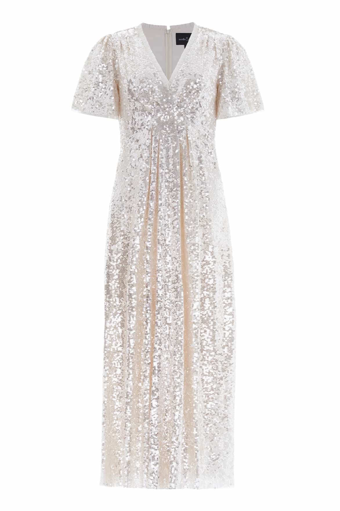 The Mila Gloss Ankle Gown in Cream. This magical piece is designed with specially sourced gloss sequins creating an extra sparkle effect. Developed with perfectly placed panels and pleats to create an effortlessly, flattering silhouette inspired by a 1930's tea dress. Make a striking appearance in the Mila.