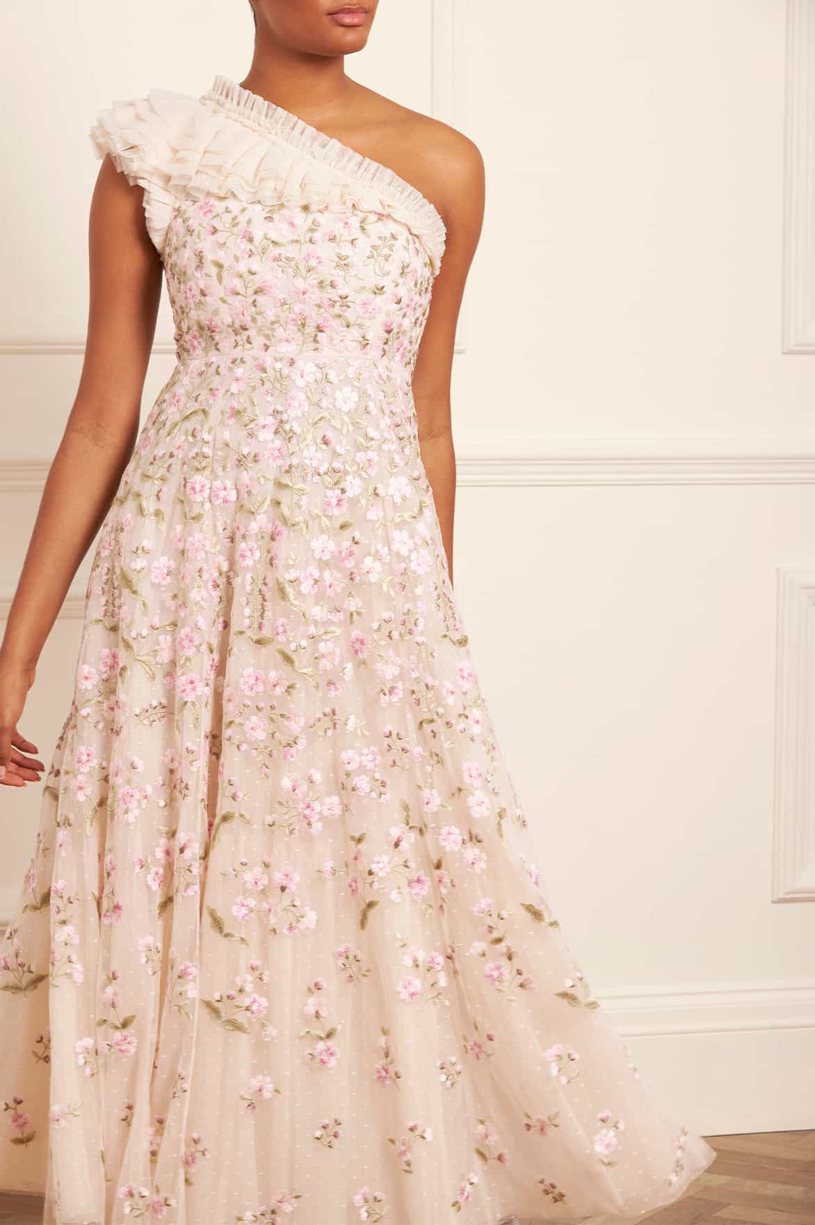 The Posy Pirouette One-Shoulder Ankle Gown in Cream / Pink. A statement style for the season ahead. This gown is beautifully embroidered with intricate, rich posy florals scattered all-over and dispersing towards the hem. Developed with a one-shoulder design and adorned with soft, tulle ruffles adding a romantic finish. Crafted with a net tulle generous skirt with a sweeping hemline. A traditional yet stylish gown.