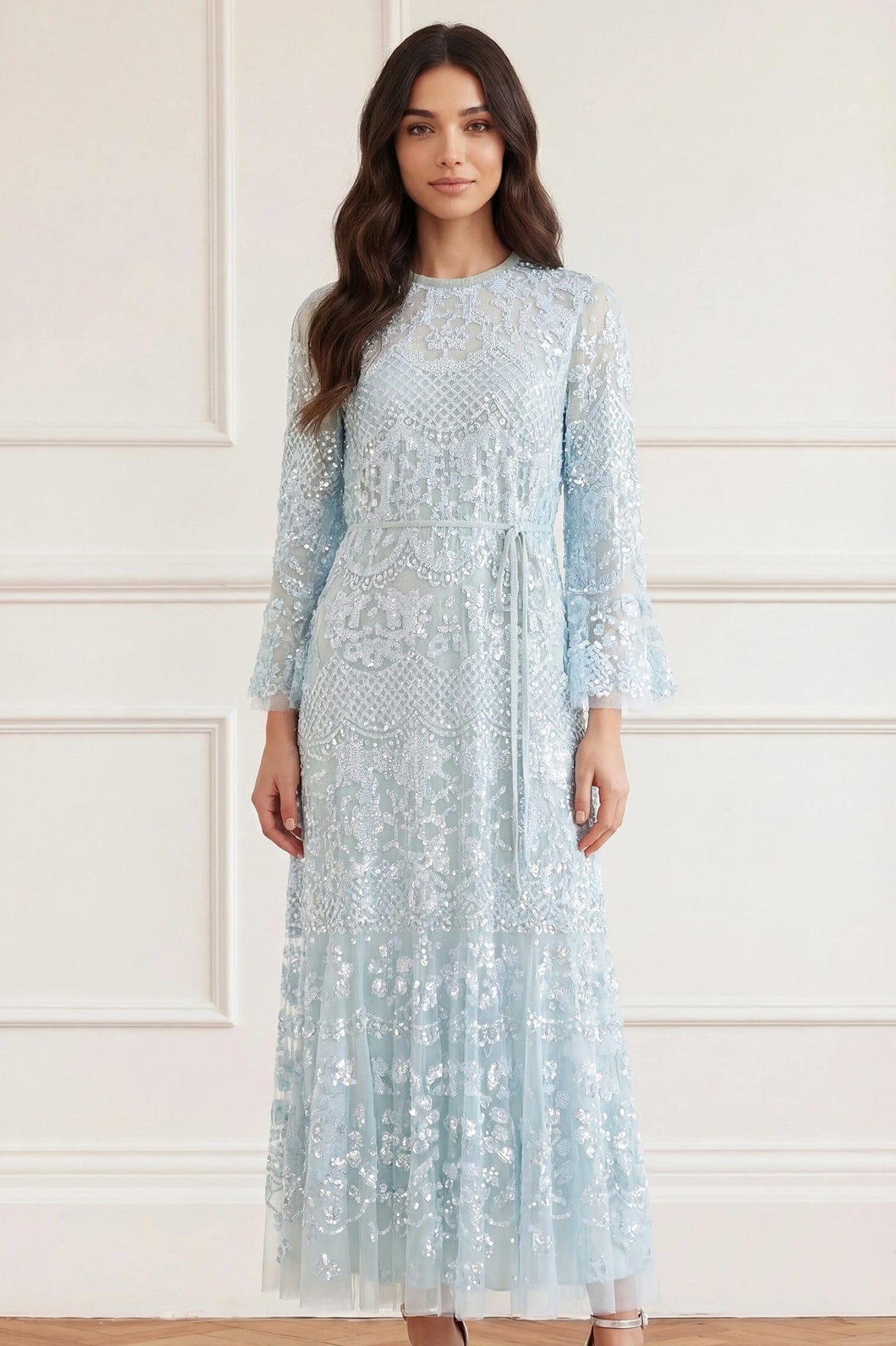 The Snowdrop Ankle Gown in French Blue. A heritage Needle & Thread design, this timeless gown features shimmering sequin artwork inspired by antique tablecloths from the early 1900s. Intricate floral borders and lattice patterns create a striking, heirloom-like embellishment. Designed for effortless elegance, the gown has a relaxed fit with a slim crepe waist tie for versatile styling. Crafted with romantic fluted sleeves, a softly tiered hem, and signature frill detailing at the neckline complete the look.