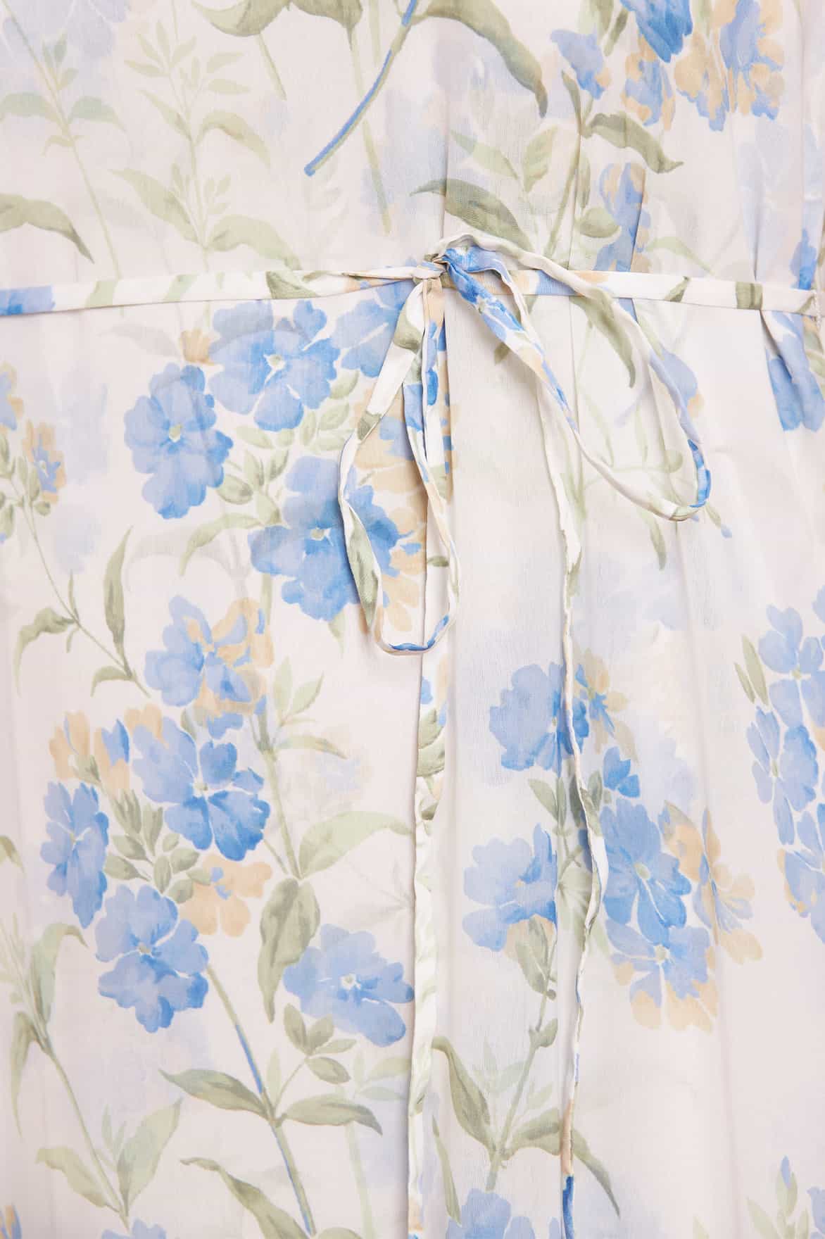 The Summer Posy Chiffon One-Shoulder Ballerina Dress in Moonshine. The print of this dress is taken from a 1930’s hand-painted wallpaper design. The artwork features a series of powder blue posies scattered in a soft formation. Developed with a one-shoulder design and generous, voluminous sleeves for a statement look. Designed with soft chiffon fabric with a loose-fit body for a relaxed silhouette. This dress includes a delicate fabric belt for versatile styling.
