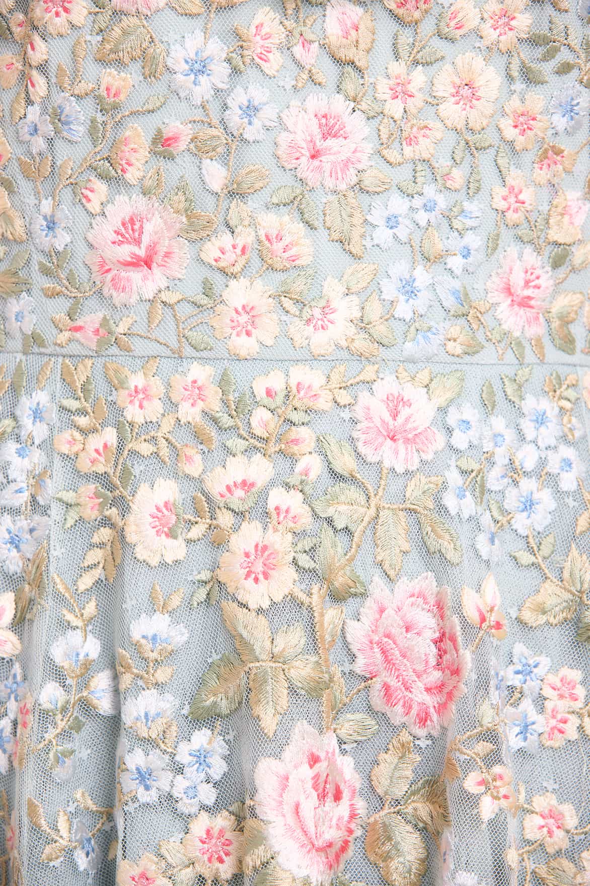 The Antoinettes Floral Off-Shoulder Micro Mini Dress in French Blue. Inspired by the grandeur of Versailles, this mini dress features delicate, multicoloured floral embroidery trailing elegantly to the hem. The off-shoulder neckline is framed with playful circle-cut frills, while layers of soft net and tulle create a full, floaty skirt with a sweeping finish. A magical blend of romance, drama, and fairytale charm.
