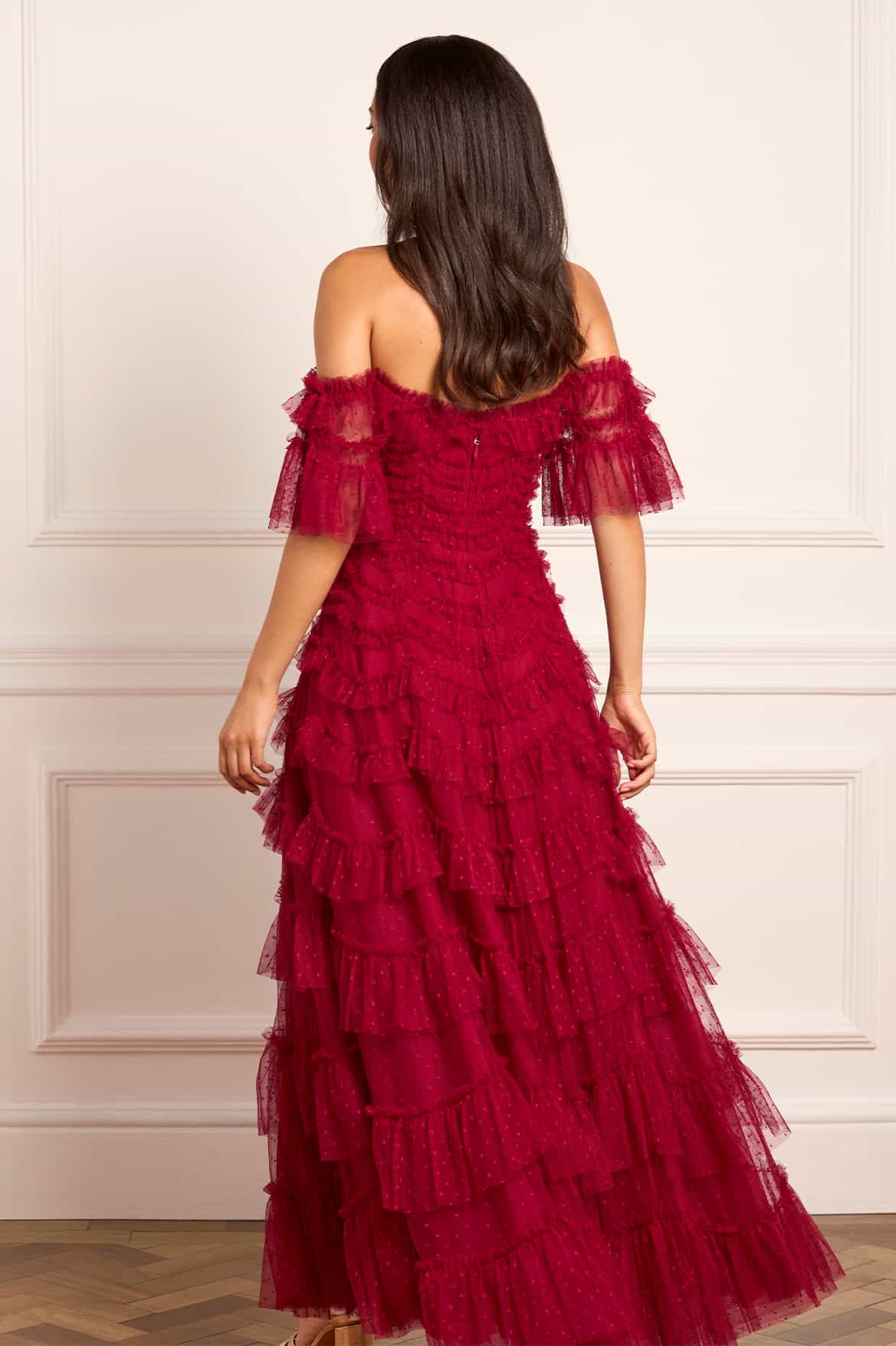 The Aviana Off-Shoulder Gown in Red. Romantic dressing is reinvented with a dramatic palette. Crafted from sculptural rows of soft tulle frills, this statement gown features scallop-tiered layers that build volume and romance. The rich red shade amplifies the gown’s drama, evoking passion and intensity.