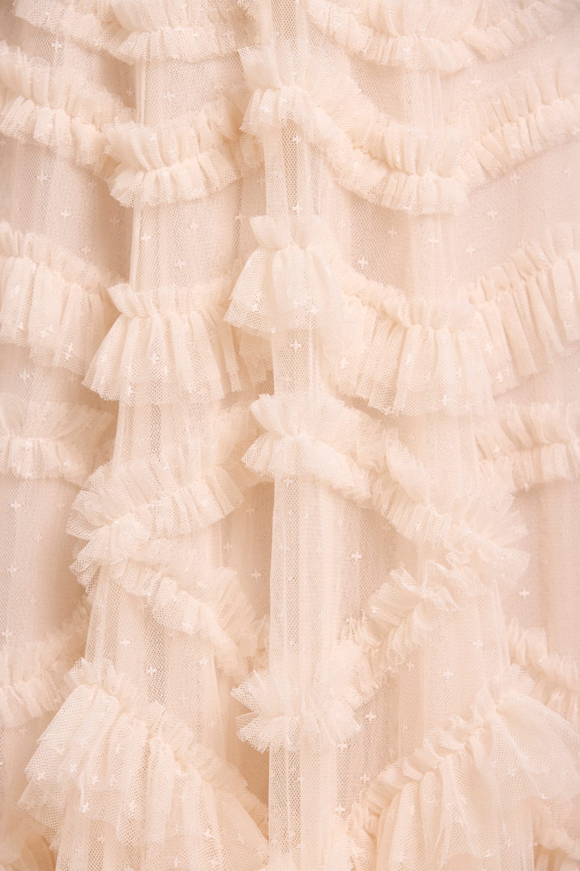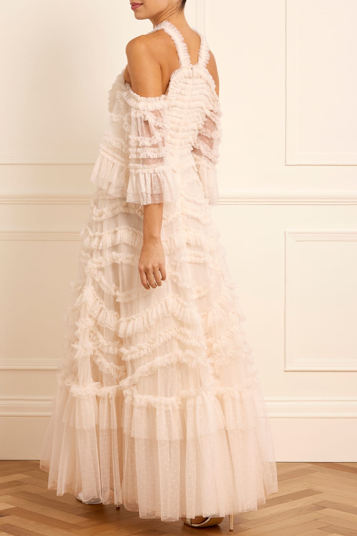 The Bronte Off-Shoulder Gown in Cream. This beautiful gown features an exquisite textile meticulously developed in 3D by the designer, directly onto the mannequin. Beautifully developed with romantic, frothy frills arranged in intricate scallops and oval designs that gracefully adorn the bodice and skirt. The statement off-the-shoulder dress has a flattering curved neckline and straps, decorated with signature Needle & Thread soft tulle ruffles. The fluted sleeves are decorated in frothy tulle ruffles and trimmed with gathered frill tiers at the cuff. The silhouette is exceptionally flattering, with a fitted bodice that flows into a generous skirt made up of layers of net and tulle, culminating in a sweeping hemline that ensures a breathtaking entrance.