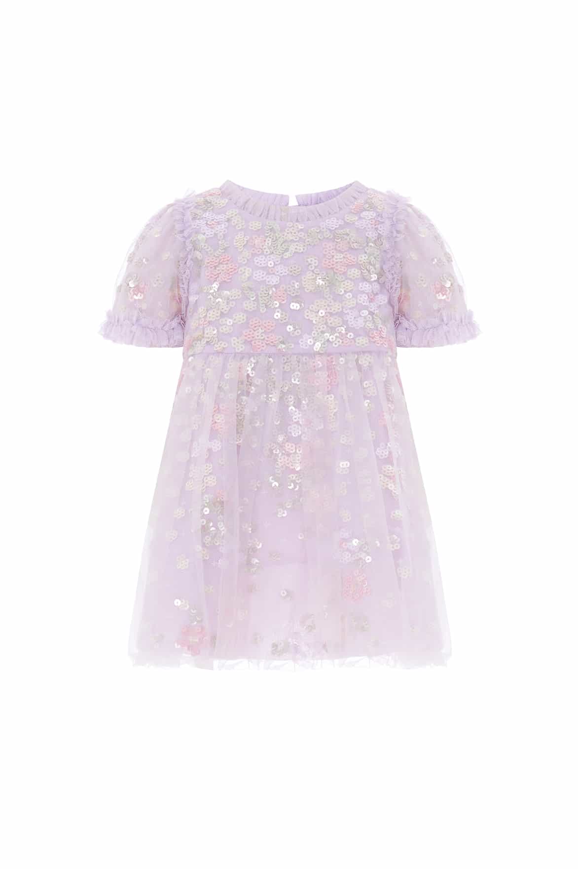 NEW SEASON. The Confetti Baby Dress in Lilac Pearl/Multi. A playful design adorned with soft floral sequins across airy tulle. With flutter sleeves and a gently gathered skirt, it’s designed for comfort and sparkle at special celebrations.