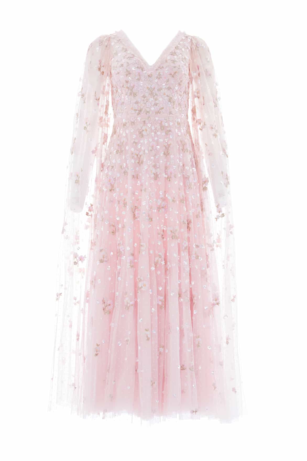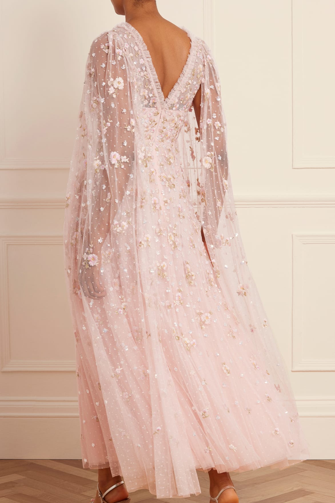 NEEDLE & THREAD EXCLUSIVE. The Dahlia Ditsy Ankle Gown in Dusk Pink. This gown is beautifully decorated with shimmering silver sequins in delicate dot motifs and intricate floral embroidery in pastel pink tones. Featuring our new floor-length cape for romantic detailing. Developed with layers of net and tulle for a full and voluminous skirt. The perfect statement style for a special occasion.