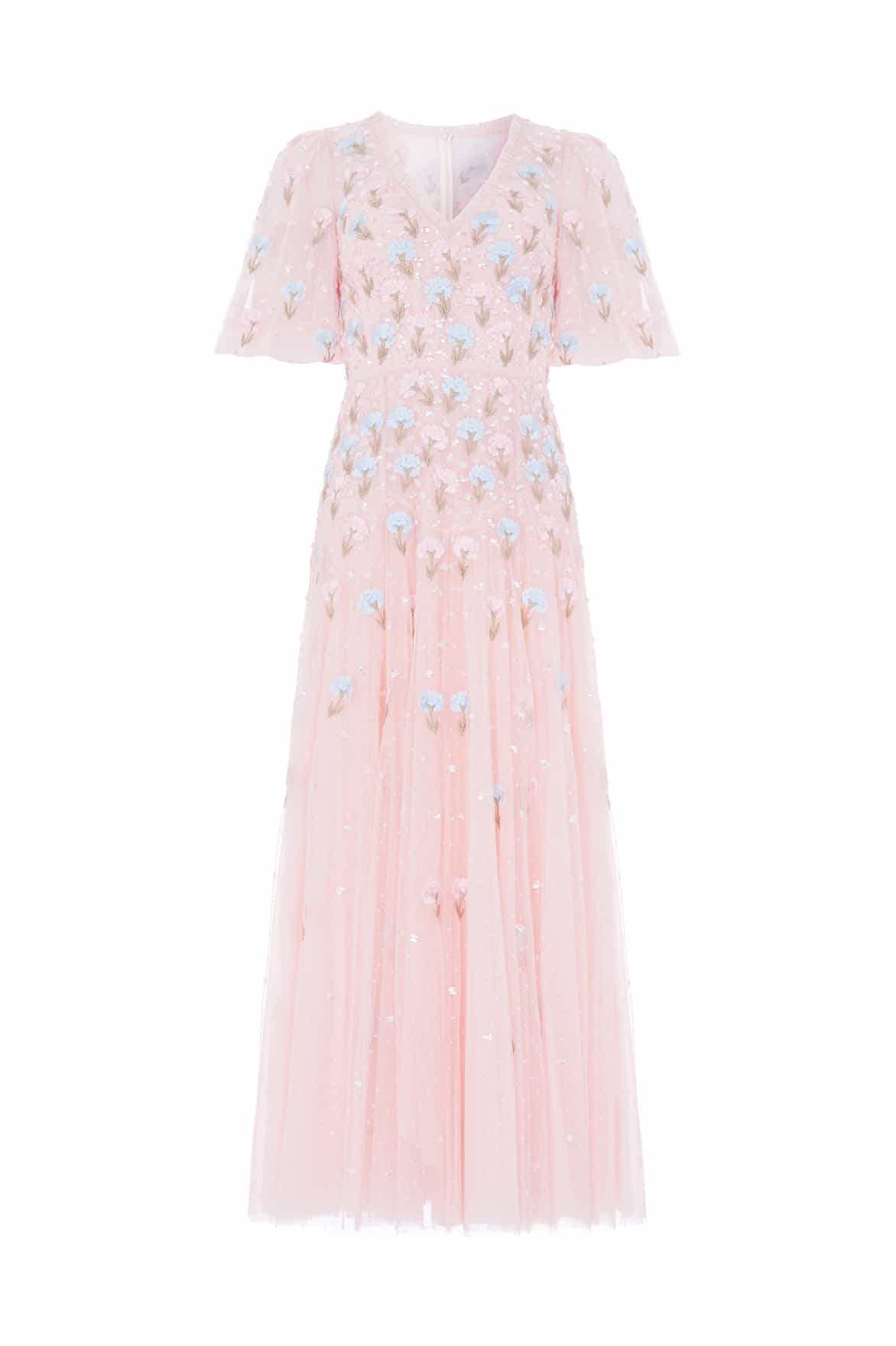NEW SEASON. The Dandelion Ditsy Ankle Gown in Seashell. Decorated with delicately stitched dandelion motifs in soft pastel tones. Crafted from airy tulle that fades gently towards the hem, this gown captures a dreamy, ethereal feel perfect for special occasions.