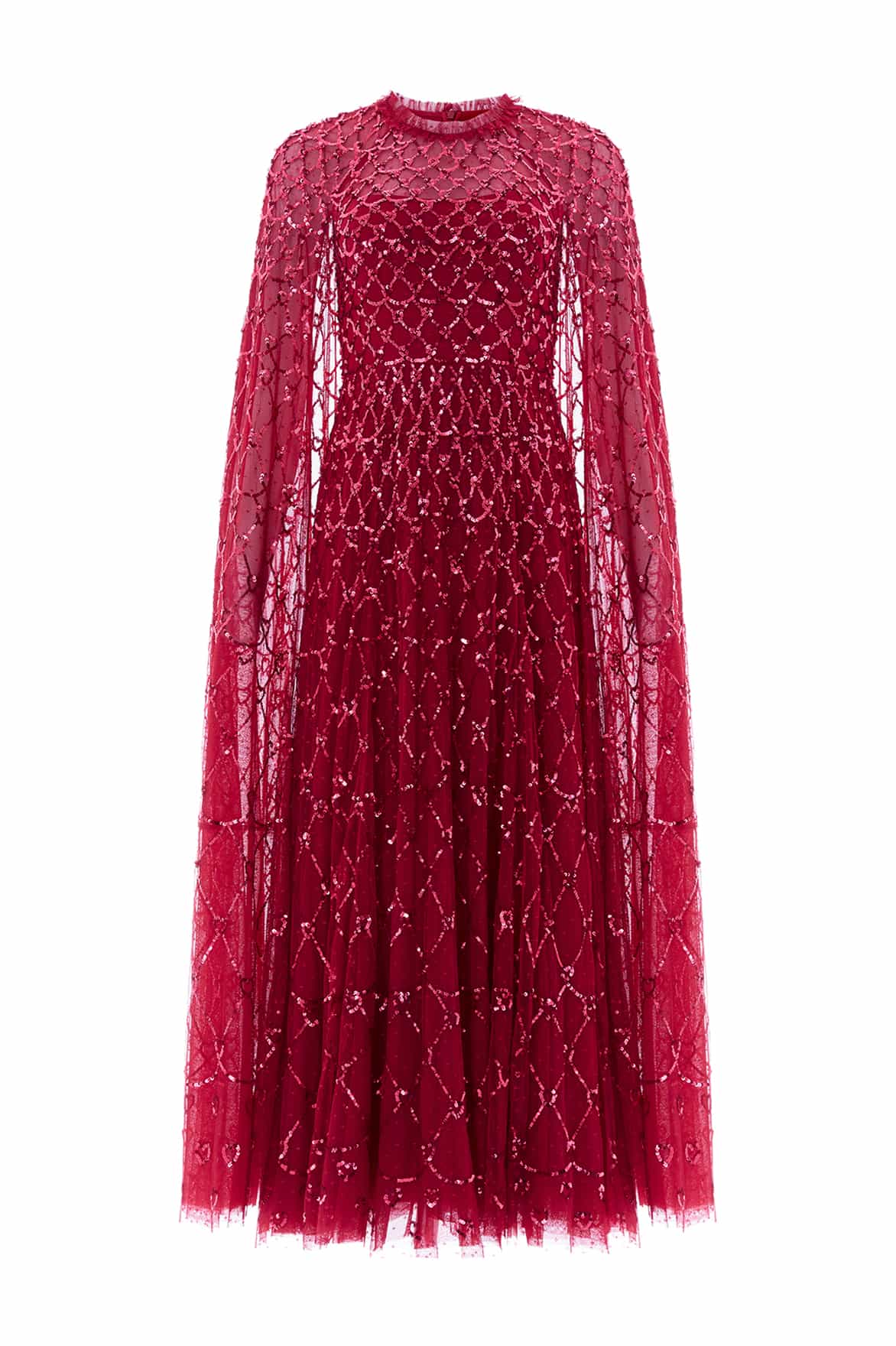 NEW SEASON. The Heart Lattice Ankle Gown in Red. Inspired by the eternal romance of the Bright Star collection, this gown is adorned with embroidered heart motifs entwined within a lattice of sequins, reminiscent of Victorian artwork. Crafted in layers of airy tulle, the fitted bodice and softly flared skirt echo the rhythm of poetry, while the bold red palette amplifies its passion. A gown designed for moments that feel as timeless as the stars.