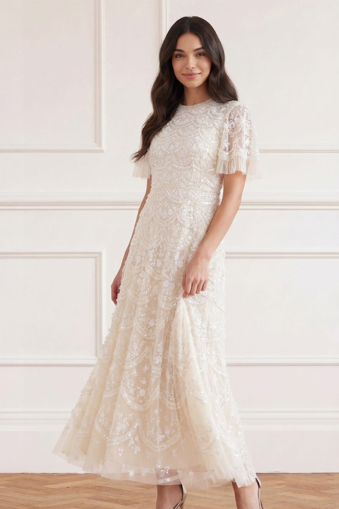 The Lily Bloom Ankle Gown in Cream. This ankle gown is beautifully designed with delicate tulle ruffles and soft scallop shaping for signature Needle & Thread styling. Adorned with intricate floral embroidery and trimmed with a high shine sequin adding shimmer throughout. Make the Lily your new wardrobe addition.