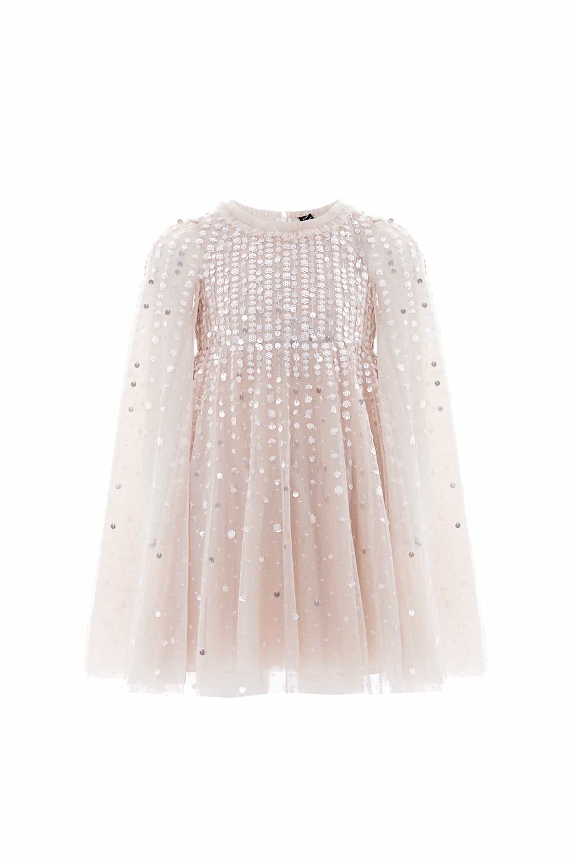 NEW SEASON. The Moonlight Sequin Cape Kids Dress in Oyster. Featuring sequins scattered across airy tulle, the dress captures the light like a starry sky. The cape sleeves flow with movement, adding an ethereal finish. In soft oyster, it is a timeless option for party season and celebrations. Match with the Moonlight Sequin Cape Sleeve Ankle Gown in Oyster from the womenswear collection for a coordinated look.