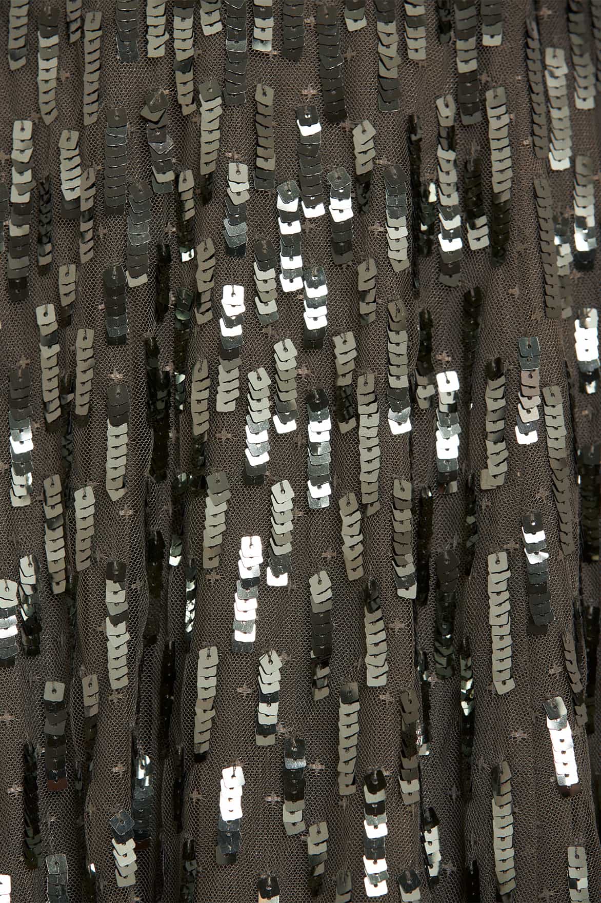 The Sequin Dash Cape Ankle Gown in Juniper. This ankle length gown is adorned with statement, square sequins in a staggered linear layout creating a shimmer throughout. Developed with a loose silhouette for an effortless, floaty feel featuring voluminous sleeves for a romantic look. This gown features a layered cape design, which can be removed for versatile styling. The skirt is crafted with layers of net tulle creating movement as you walk. The perfect gown for an upcoming special occasion.