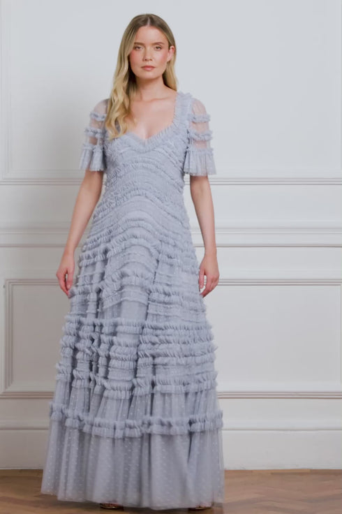 NEW SEASON. The Amara Ruffle Gown in Skylight. A true statement of romantic artistry. Crafted from layers of frothy tulle, the gown features curved bands of ruffles that flow gracefully across the body and cascade into a voluminous skirt, creating dramatic movement and charm.