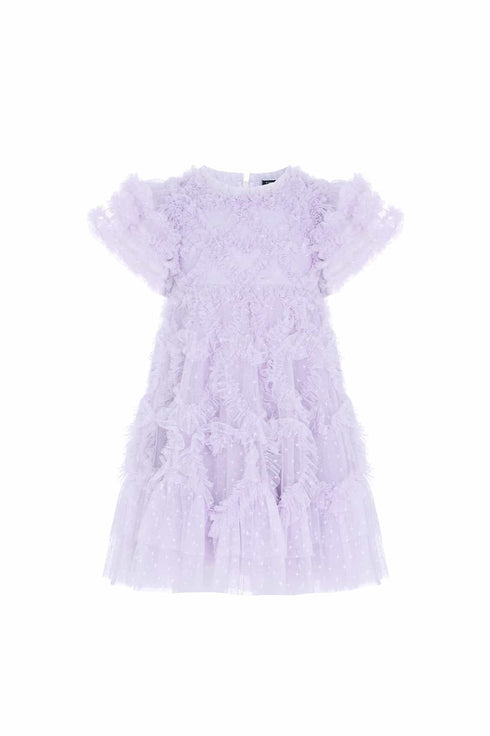 NEW SEASON. The Amorette KIDS Dress in Dusk Lilac. A signature Needle & Thread KIDS dress for the season ahead. Beautifully adorned with a love heart motif, made from gently gathered delicate tulle. Designed with playful, frothy sleeves created by using layers of delicate tulle and frills. Featuring a generous, voluminous skirt layered with tulle and net for a magical silhouette. The perfect mini-me version of our RTW style.