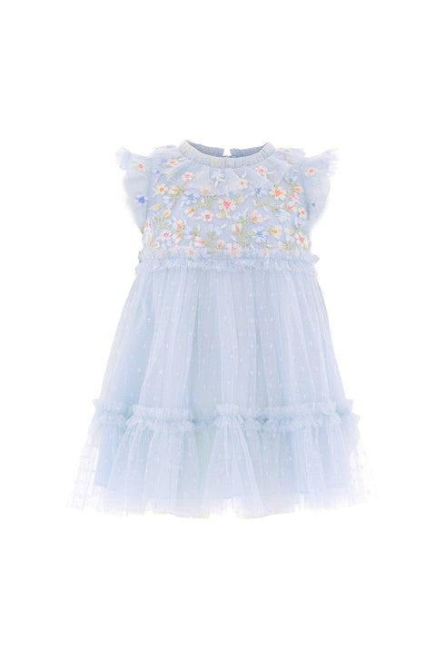 The Antoinettes Floral Bodice Baby Dress in Dusk Blue. A dreamy piece inspired by the romance of Versailles. Crafted with delicate multicoloured floral embroidery scattered across a cloud of tulle, signature frills at the neckline and waist add a touch of enchantment. Designed with layered tulle sleeves and a gently ruffled skirt, it creates a floaty, ethereal silhouette. Finished with a breathable cotton voile lining and frilled bloomers for comfort. This dress is perfect for every magical moment.