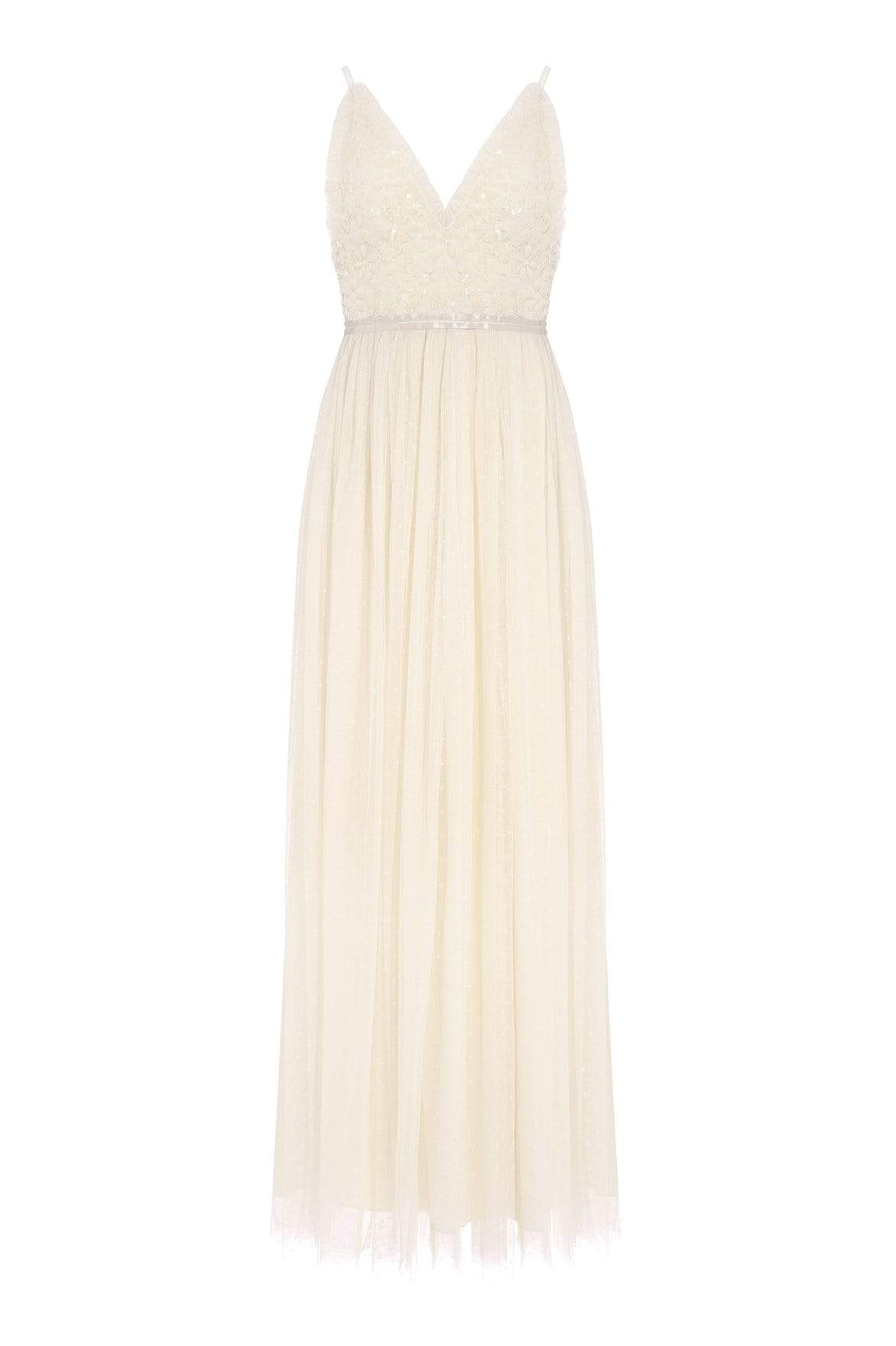 The Aurelia Bodice Cami Gown in Champagne. This Needle & Thread signature style is beautifully designed with floral lace artwork inspired by a vintage tablecloth. Adorned with shimmering sequins on the bodice gently flowing into a soft tulle full length skirt. Make an entrance in the Aurelia.