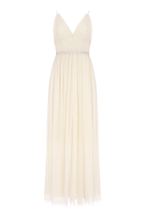 The Aurelia Bodice Cami Gown in Champagne. This Needle & Thread signature style is beautifully designed with floral lace artwork inspired by a vintage tablecloth. Adorned with shimmering sequins on the bodice gently flowing into a soft tulle full length skirt. Make an entrance in the Aurelia.