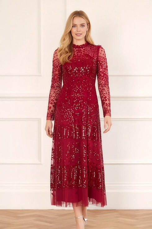 NEEDLE & THREAD EXCLUSIVE. The Aurora Ballerina Dress in Cherry Red. This light-catching ankle-length dress is decorated with red shimmering sequins, and was inspired by a vintage lace tablecloth. The Aurora Ballerina is a long-sleeve dress with pretty floral elements, and a flattering silhouette. There is delicate frill lace detailing around the neck and arm for further intrigue. Style yours with an on-trend hair ribbon for the perfect look.