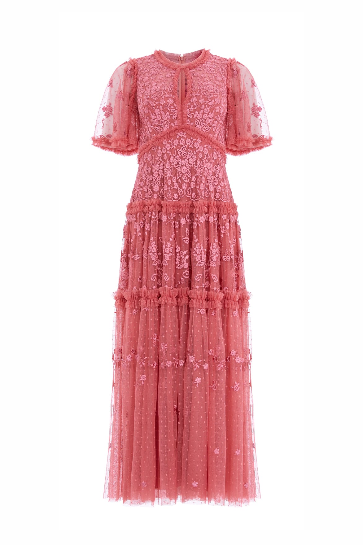 The Autumn Lace Ankle Gown in Autumn Rose. This signature Needle & Thread style is designed with floral motif embroidery inspired by antique lace designs. This gown is developed with romantic fluted sleeves, a gathered tiered hem, and is created from layers of soft tulle to create a flattering silhouette. A classic and contemporary style.