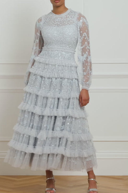 -Form fitted through the bodice with a relaxed fit through the sleeve and a multi-tiered full skirt