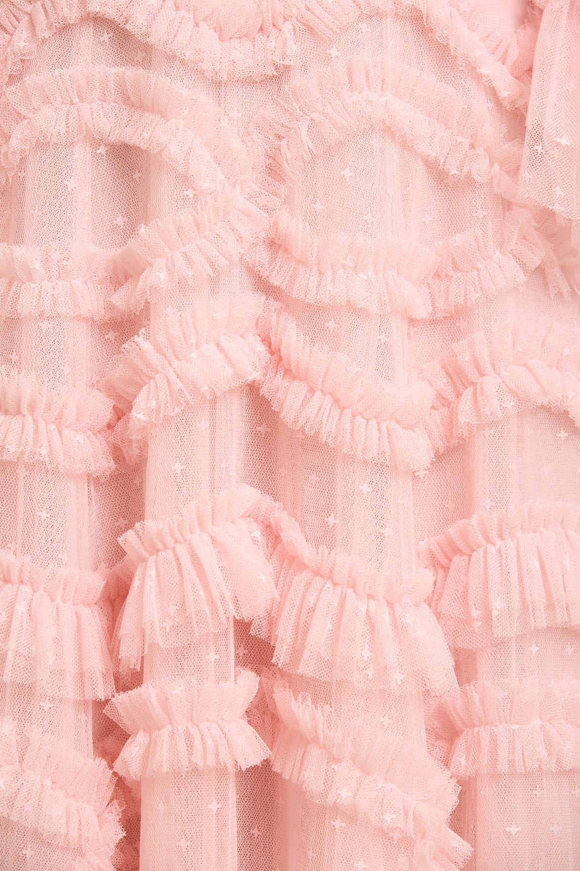 The Bronte Off-Shoulder Ballerina Dress in Dusk Pink. This beautiful dress features an exquisite textile meticulously developed in 3D by the designer, directly onto the mannequin. Beautifully developed with romantic, frothy frills arranged in intricate scallops and oval designs that gracefully adorn the bodice and skirt. The statement off-the-shoulder dress has a flattering curved neckline and straps, decorated with signature Needle & Thread soft tulle ruffles. The fluted sleeves are decorated in frothy tulle ruffles and trimmed with gathered frill tiers at the cuff. The silhouette is exceptionally flattering, with a fitted bodice that flows into a generous skirt made up of layers of net and tulle, culminating in a sweeping hemline that ensures a breathtaking entrance.
