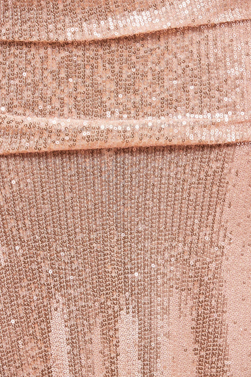 The Camille Long Sleeve Gown in Pearl Pink. This gown exudes vintage Hollywood glamour. Featuring a scoop neck with sequin frill and a slim silhouette, it gracefully drapes across the body. Crafted from a stretch mesh base, its delicate sequins create a shimmering effect, adding timeless elegance to this romantic gown – a true treasure for years to come.