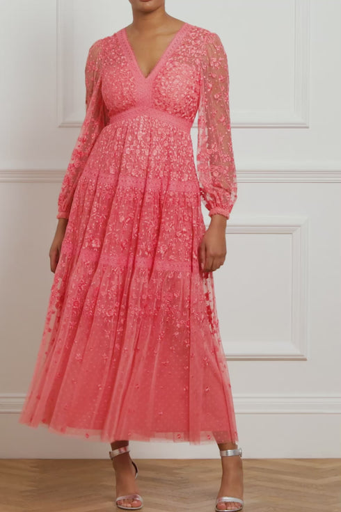 The Celestia Ribbon Ankle Gown in Sky Pink. This gown has been intricately designed with rich embroidery inspired by vintage lace, featuring delicate floral motifs and ribbon bows throughout. Crafted with pretty lace trims for signature Needle & Thread detailing, and delicately constructed with a textured tulle fabric base. Featuring a V-shaped neckline and a new, ultra-flattering silhouette. Make the ultimate statement in the Celestia.