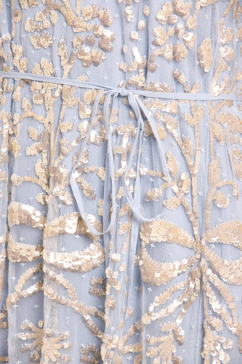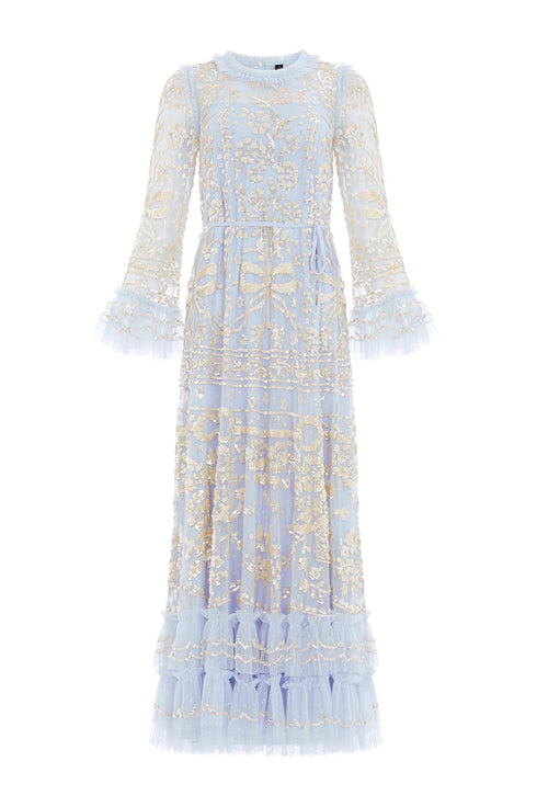 The Celia Long Sleeve Ankle Gown in Dusk Blue/Gold. This statement gown is designed with romantic artwork featuring ornate florals and ribbon bows, densely embellished with shimmering sequins for exquisite detailing. Crafted with an effortless loose fit with soft, playful tulle frills on the hem and cuffs. A key piece in our collection.