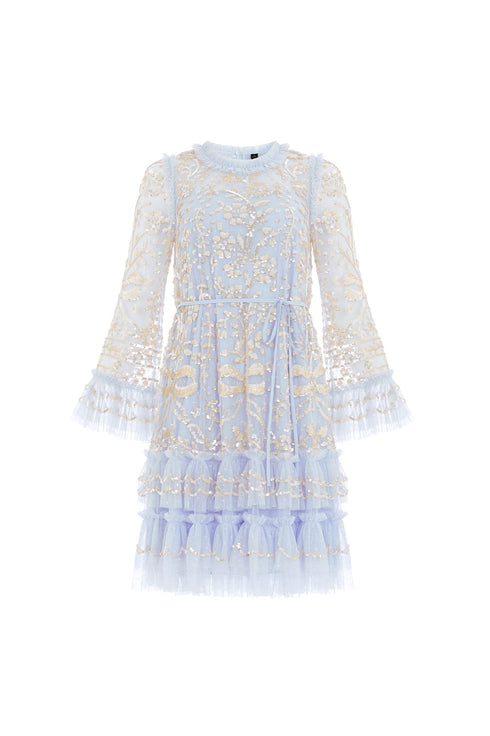 The Celia Long Sleeve Mini Dress in Dusk Blue/Gold. This statement dress is designed with romantic artwork featuring ornate florals and ribbon bows, densely embellished with shimmering sequins for exquisite detailing. Crafted with an effortless loose fit with soft, playful tulle frills on the hem and cuffs. A key piece in our collection.