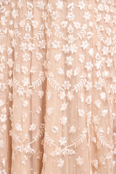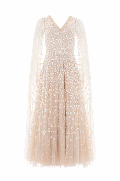 NEW SEASON. The Clover Cape Sleeve Ankle Gown in Beige/Cream. A romantic, vintage-inspired silhouette. Delicate embroidery decorates the signature kisses 'x' tulle base with ditsy florals and scalloped foliage designs. The softly draped cape sleeves add a whimsical touch, while the embroidery widens and disperses towards the hem for an ethereal finish.