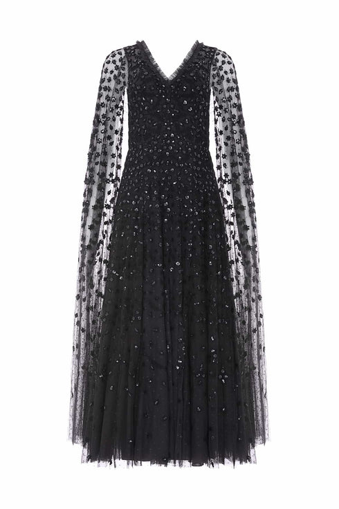 NEW SEASON. The Clover Cape Sleeve Ankle Gown in Graphite. A romantic silhouette inspired by vintage lace designs from the early 1900s. Adorned with delicately embroidered ditsy florals and scalloped foliage motifs, the gown features soft cape sleeves for an ethereal touch. The embroidery gradually widens toward the hem, dissolving into swirling floral patterns for a soft, whimsical finish. A perfect choice for seasonal events and graceful occasions.