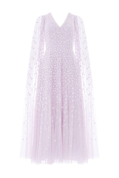NEW SEASON. The Clover Cape Sleeve Ankle Gown in Powder Lilac. Features fluid cape sleeves and a soft flowing silhouette inspired by painted English gardens. Designed to move beautifully, this style offers effortless elegance for special occasions.
