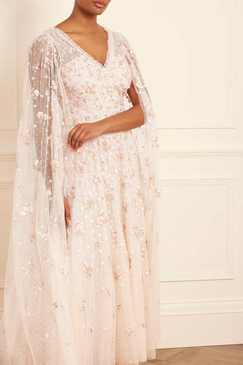 The Dahlia Ditsy Ankle Gown in Cream. This gown is beautifully decorated with shimmering silver sequins in delicate dot motifs and intricate floral embroidery in pastel pink tones. Featuring our new floor-length cape for romantic detailing. Developed with layers of net and tulle for a full and voluminous skirt. The perfect statement style for a special occasion.