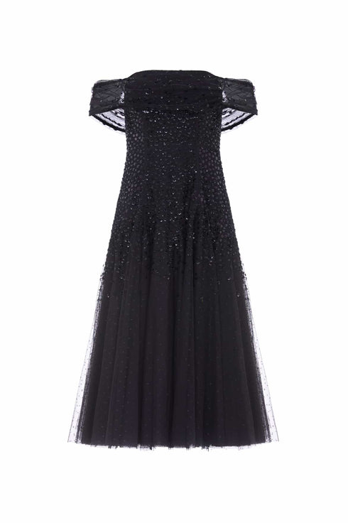 NEW SEASON. The Dappled Sequin Draped Off-Shoulder Midaxi Dress in Graphite. A contemporary statement style covered in clustered dot sequin motifs that scatter toward the hem. The draped neckline and midaxi length offer a striking silhouette. Pair with heels and jewellery of your choice for a dramatic entrance.