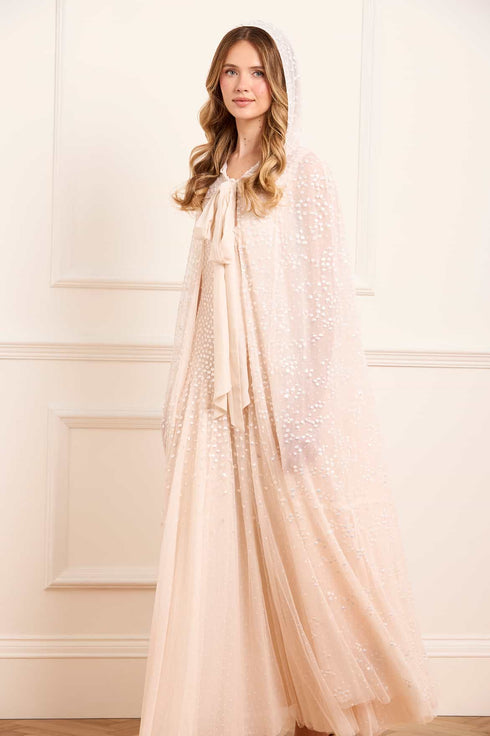 NEW SEASON. The Dappled Sequin Hooded Long Cape in Cream/Opal. A dramatic statement layer, designed for elegant outerwear moments. Scattered all over with delicate dot sequins that shimmer as they catch the light, the cape features a hood and flowing hem. Style over the Sequin Cascade Cami Plunge Gown for added glamour.